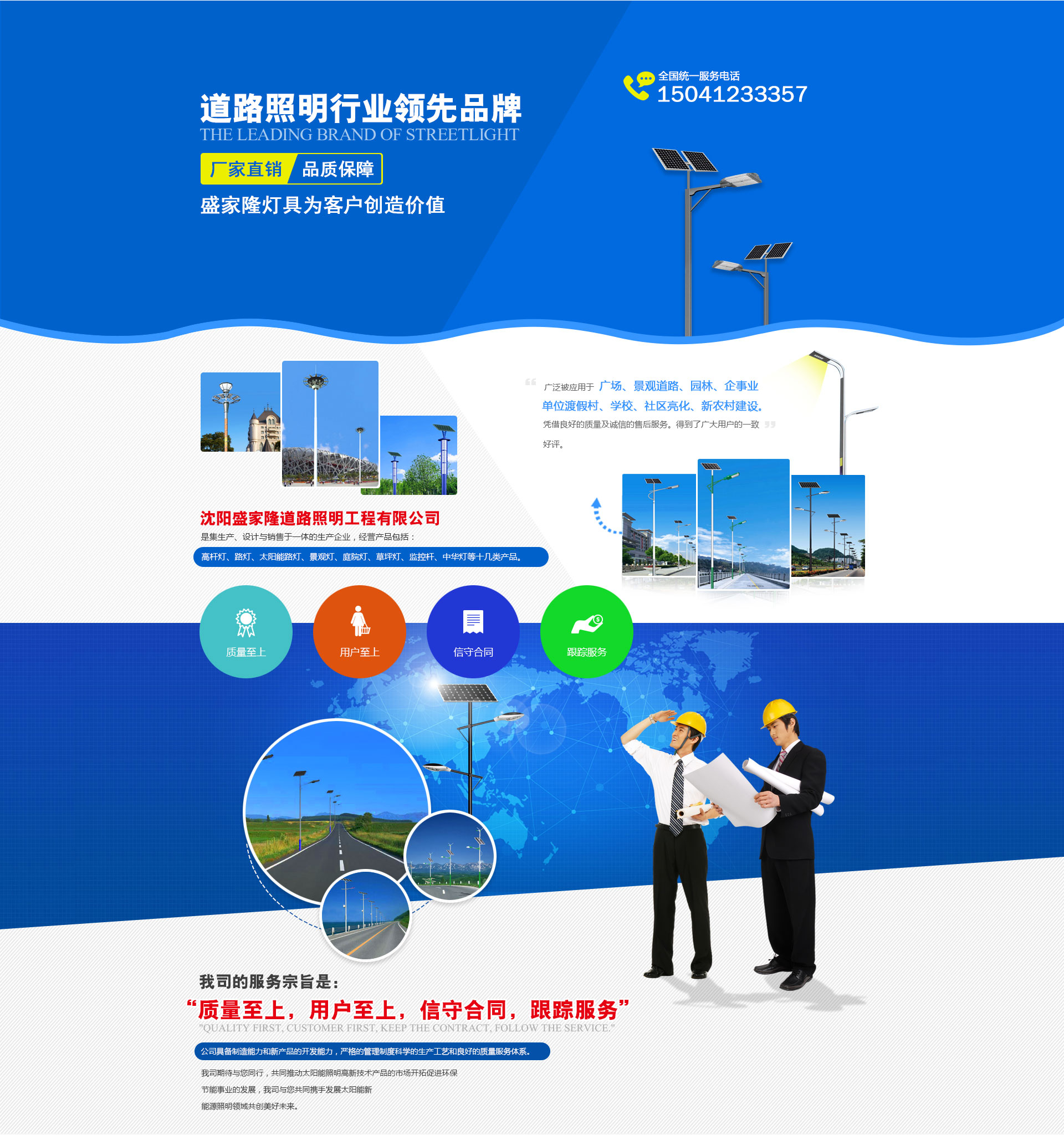 沈陽盛家隆道路照明工程有限公司坐落于沈陽市于洪區興盛村愛國,生產各種室外,道路,廣場,車站,碼頭,橋梁,庭院及室內工礦照明燈具,品種有太陽能路燈,道路燈,LED路燈,組合燈,景觀燈,庭院燈,草坪燈,彩色泛光燈,中高桿燈以及配套使用的各種路燈頭,鎮流器,觸發器開關箱等系列產品。 本公司自成立以來,已初具規模,現有高級技術人員5人,中級技術人員28人,研究設計人員14人,車間工人百余人,并備有大型斬彎機,1600t-900t壓鑄機,20t行吊,高速縱剪機,埋弧自動焊,彩色噴塑線燈先進設備,高科技創造高質量,由我公司生產的各種類型的照明燈具,不僅質量可靠而且線條流暢,外形美觀,深受廣大客戶的喜愛,長期以來,我公司一直注重產品質量,堅持“質量是企業的生命”的宗旨。由于質量可靠,價格合理,服務周到,從而贏得了廣泛的市場聲譽。企業先后被評為“質量信得過企業”“重誠信守信用企業”,“AAA級資信企業”,并通過ISO9001:2000國際質量體系認證,ISO14001:2004環境管理體系認證,CCC,CQC國家強制性產品認證和持有道路照明二級安裝,安全生產資質。